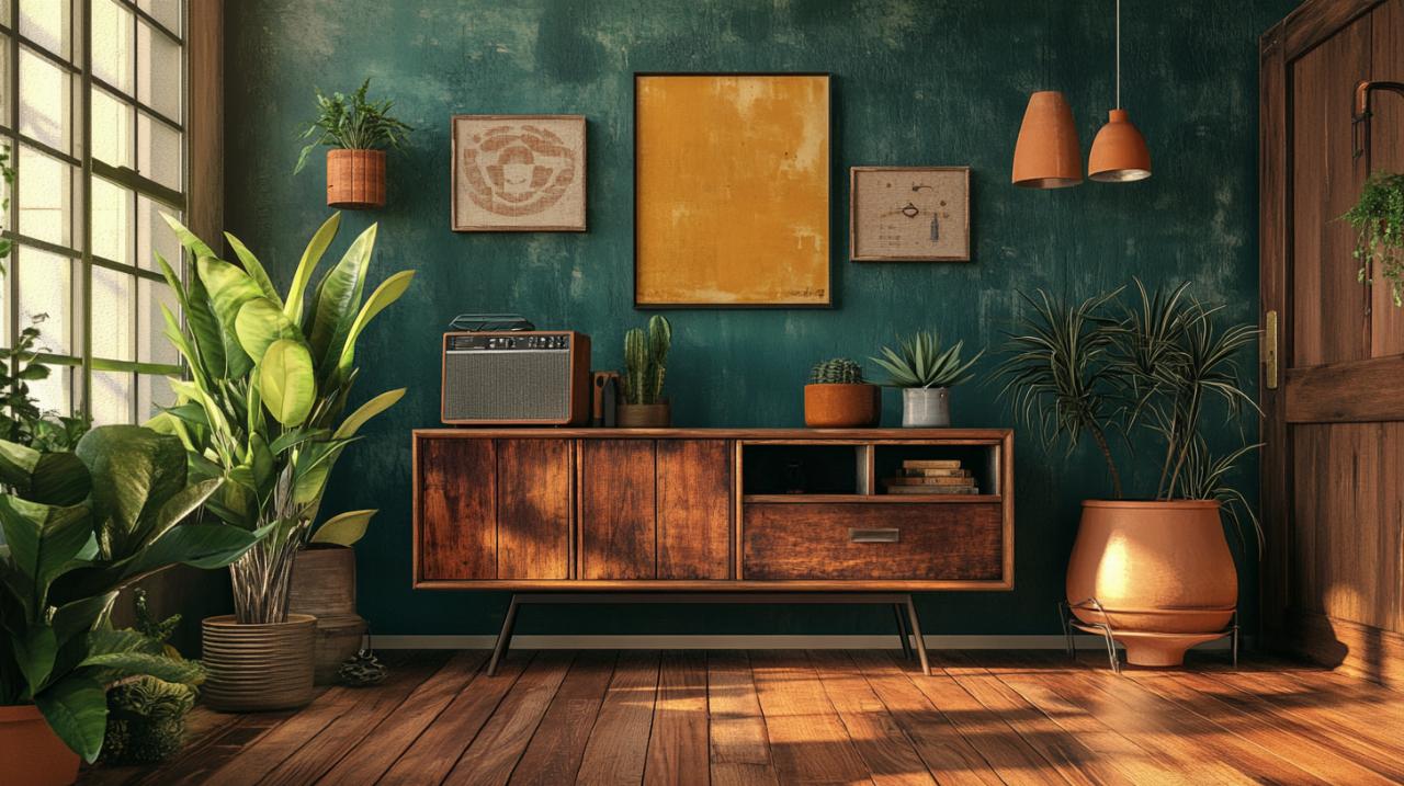 Pour réussir cette intégration, la cohérence chromatique constitue un élément fondamental. Les tonalités naturelles du bois recyclé s'accordent parfaitement avec les couleurs sombres souvent présentes dans les intérieurs vintage, comme les gris anthracite, les bruns profonds ou les verts forêt. Les accents métalliques du bahut font écho aux objets décoratifs en laiton, cuivre ou bronze fréquemment utilisés dans le style vintage. Cette continuité visuelle permet au buffet industriel de s'inscrire naturellement dans l'ensemble décoratif sans créer de rupture visuelle trop marquée.